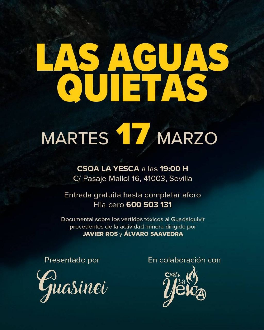 El martes 17 proyectamos el documental Las aguas quietas, donde se recogen las voces de quienes alertan sobre el desastre que se nos viene con este nuevo impulso a la minería en nuestro territorio. Después habrá tertulia con los directores y grupos ecologistas para buscar soluciones juntas.