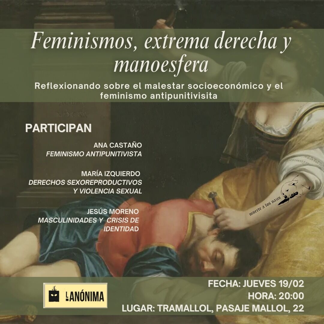 El jueves 19 de febrero a las 20.00 h organizamos un espacio de reflexión colectiva "Feminismos, extrema derecha y masculinidades. Reflexionando sobre el malestar socioeconómico y el feminismo antipunitivista"