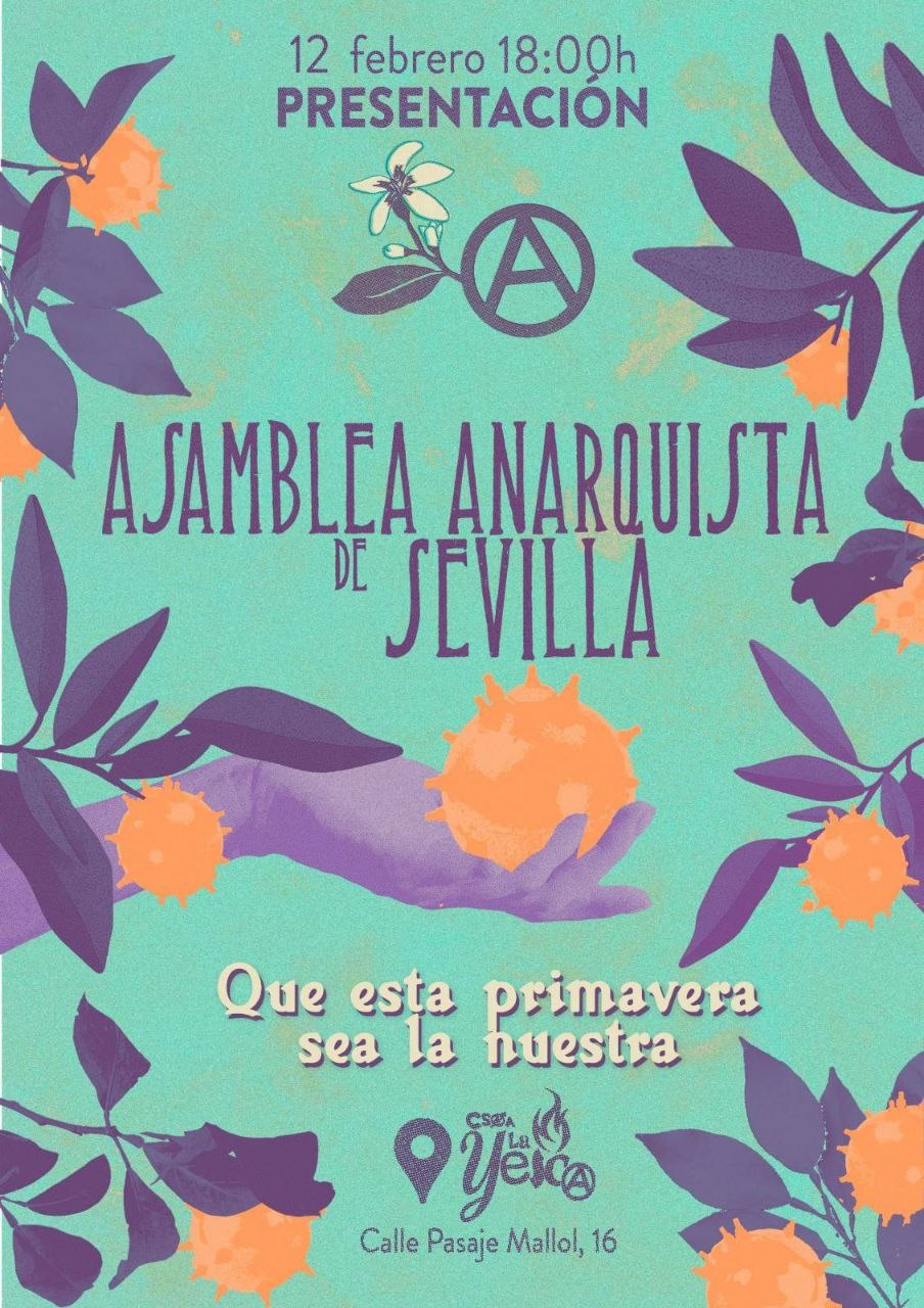Tras un par de años trabajando internamente, nos hace mucha ilusión invitaros a la presentación de la Asamblea Anarquista de Sevilla el próximo 12 de Febrero a las 18:00h en @csoa_la_yesca